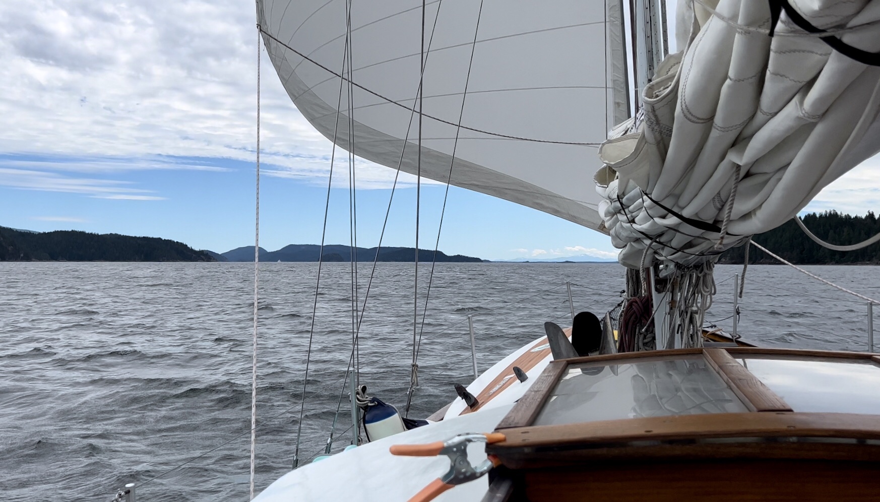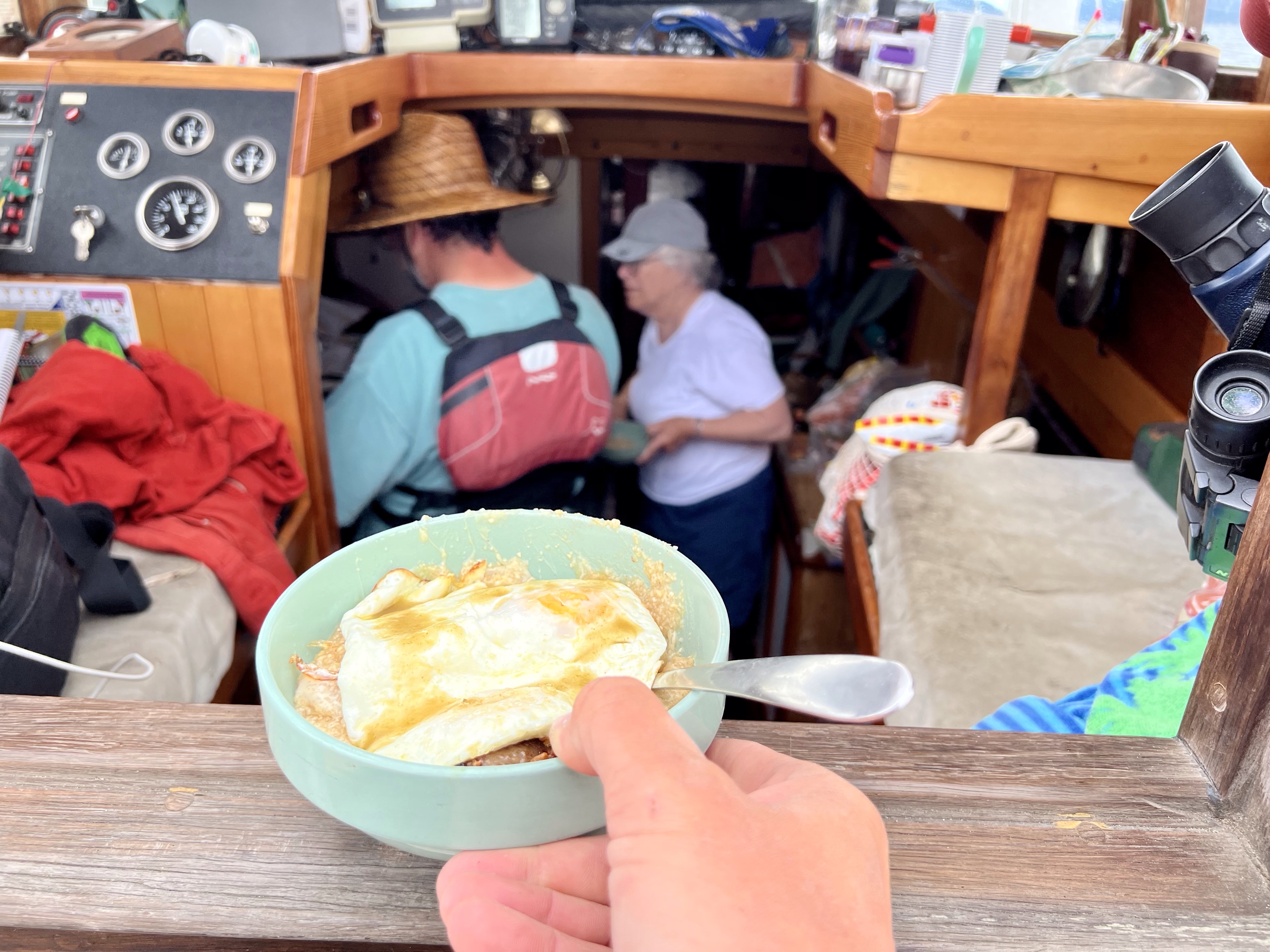 Coop was awake first. The wind was strong and he was wanting to make sure the anchor held. Didn’t want us blown up against the rocks. We sat together, looked over charts and talked about where we wanted to go next. We’d planned to meet up with Ron and his family but several members got sick. Helen might be ready to cruise on Saturday or maybe Friday. Nate gave Ron a call while we were at the table in the cabin and he gave us lots of ideas of good places to tuck into. We’d like to see Prideaux Haven but will probably find another place to anchor.